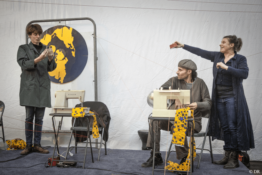 En musique, en paroles, dans une mise en jeu des objets, avec des apparitions marionnettiques, les récits « historiques » et personnels émergent. Les fils de coton fendent l’espace et le morcellent. Les machines-à-coudre, initialement outils d’usine, deviennent des instruments de musique avant de se faire automates. Les pièces de wax se déroulent et s’incarnent en marionnettes…
