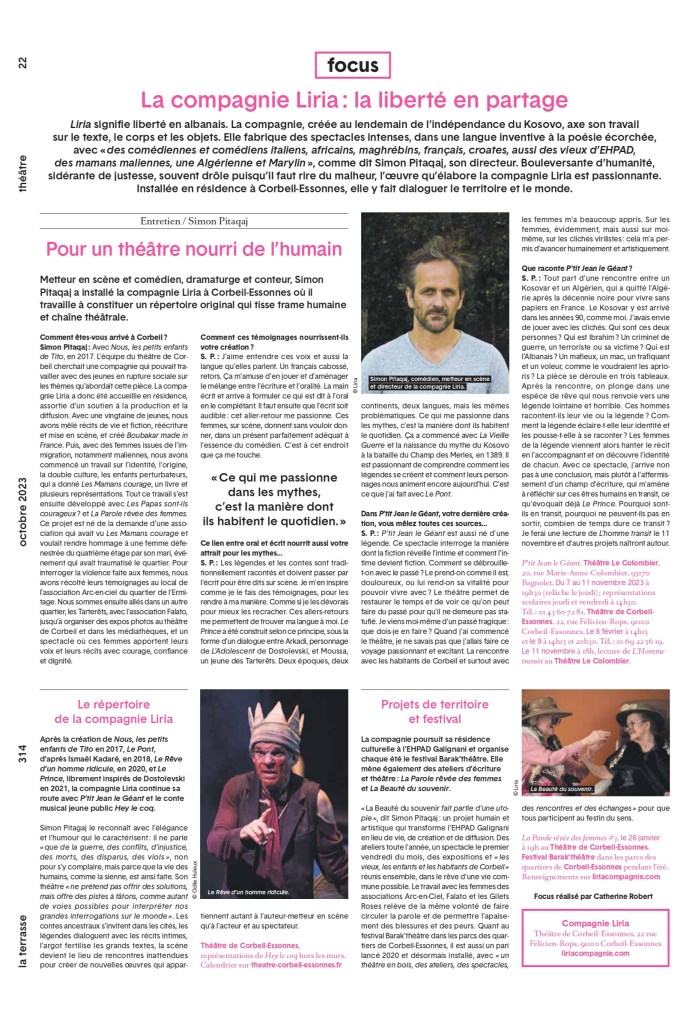 Après la création de Nous, les petits enfants de Tito en 2017, Le Pont, d’après Ismaël Kadaré, en 2018, Le Rêve d’un homme ridicule, en 2020, et Le Prince, librement inspirés de Dostoïevski en 2021, la compagnie Liria continue sa route avec P’tit Jean le Géant et le conte musical jeune public Hey le coq. Catherine Robert, journal La Terrasse